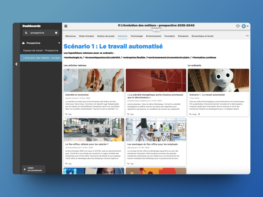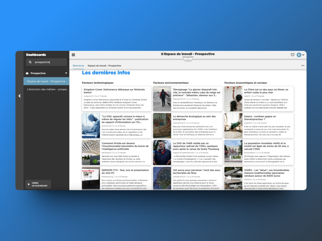 En un simple clic, ajoutez des éléments clés tels que des études, des graphiques, des entretiens, des fiches acteur, des articles, des fiches métier, ou encore des fiches pays/ville directement dans votre dashboard. Parfait pour mettre en avant des informations spécifiques, ce bloc vous offre une flexibilité totale pour personnaliser votre portail de veille. De plus, vous avez toujours la possibilité de créer vos propres ressources depuis l’espace Document, rendant votre expérience encore plus enrichissante.