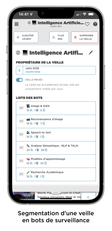 Grâce à la recherche transverse sur Curebot, il est possible de trouver les veilles, les bots, les smartfolders, les newsletters, mais aussi les groupes qui incluent votre terme. Un excellent moyen pour trouver les personnes qui travaillent déjà sur la thématique qui vous intéresse. Vous pouvez ainsi vous y abonner, voire les contacter directement. Ils peuvent être d’une aide précieuse si vous avez besoin d’un renseignement en particulier sur le sujet ou si vous souhaitez construire une surveillance proche de leur domaine de prédilection.