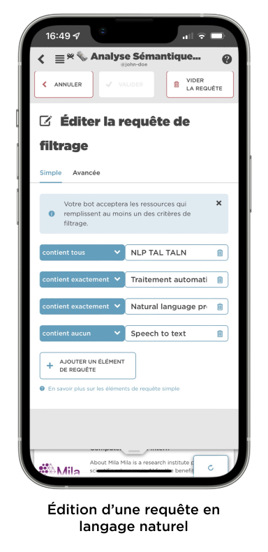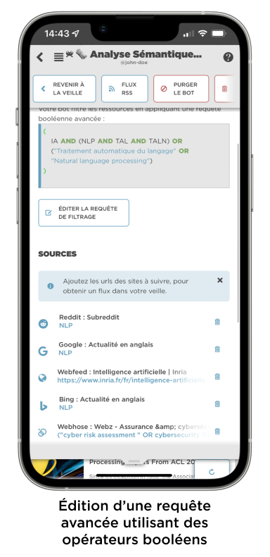 Grâce à cette première recherche, vous pouvez tester les filtres et les sources pour évaluer votre flux d’information. Sur Curebot, il est possible de tester vos premières idées avec l’édition d’une requête simple, puis des requêtes plus avancées dans un second temps, en quelques clics.