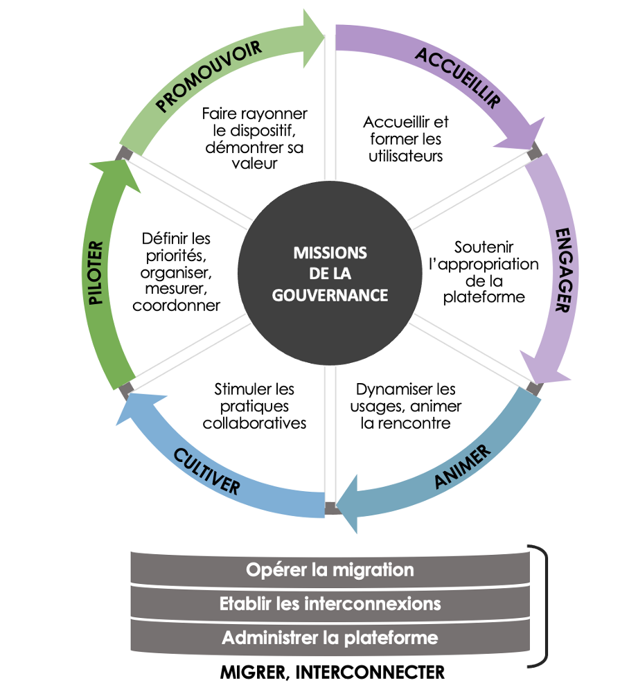 Communiquer sur le lancement, promouvoir les initiatives accompagnées, stimuler les contributions, animer les réseaux qui seront constitués, administrer la plateforme, rendre compte aux sponsors… Le schéma ci-après vous donne une idée de l’éventail d’activités qu’une gouvernance peut être amenée à réaliser.
