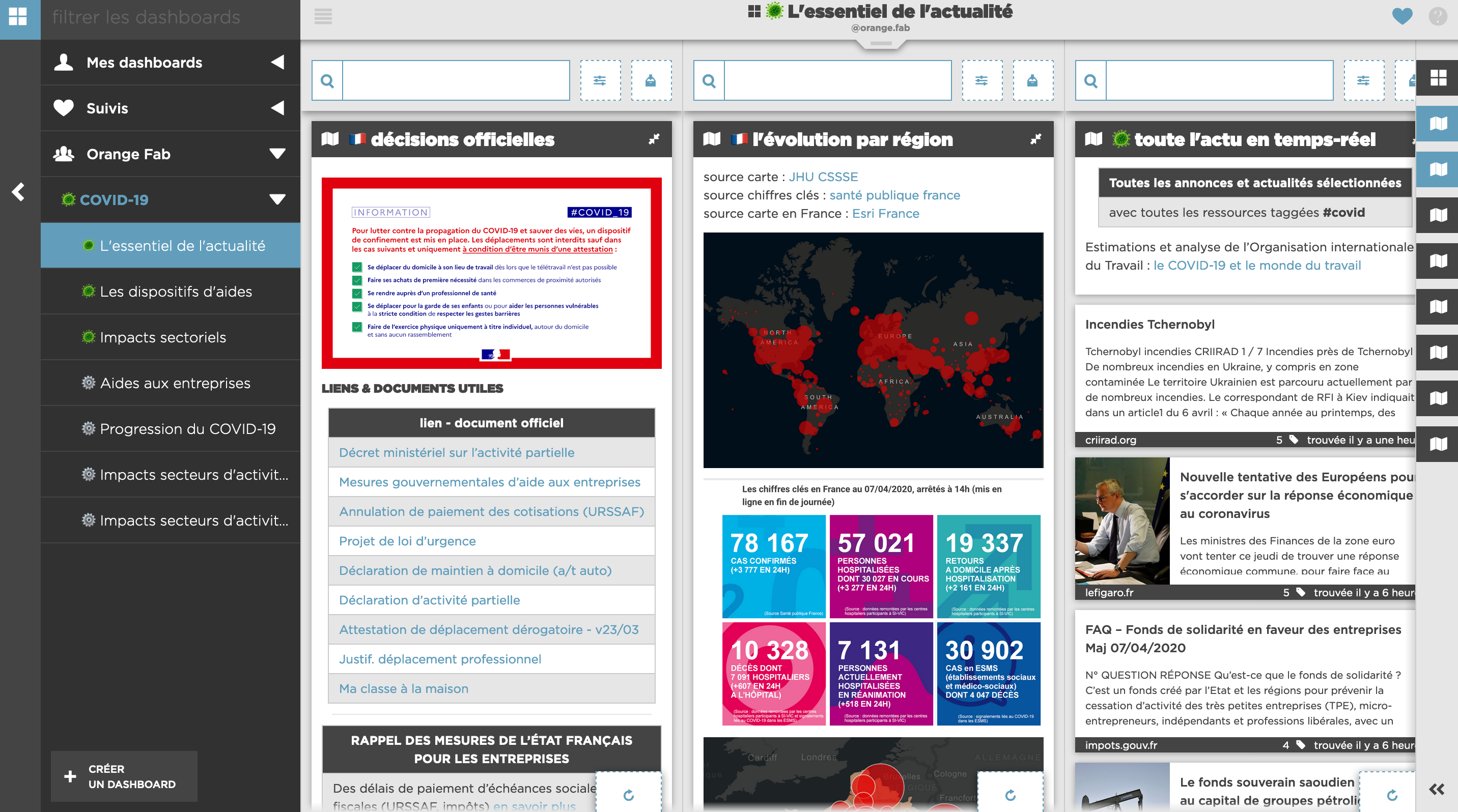 Le dashboard Covid-19 construit pour OrangeFab dans Curebot