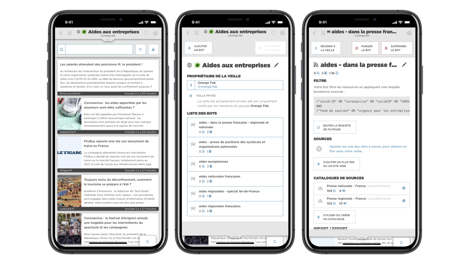 La création de surveillances se fait par l’ajout d’une veille contenant des bots. Les bots comprennent des sources ou catalogues de sources auxquels il est possible d’ajouter une requête de filtrage. Les bots vont ensuite aller vérifier régulièrement, sur chacune des sources renseignées s’il existe de nouvelles informations répondant à la requête de filtrage. Pour OrangeFab, pour la veille sur « les aides aux entreprises », six bots ont été créés. La création de plusieurs bots pour une veille permet de bien associer un filtre à un type de source, afin de gagner en précision et ne remonter ainsi que des informations pertinentes. La construction des bots est rapide, d’autant qu'un grand nombre de catalogues de sources existe déjà.