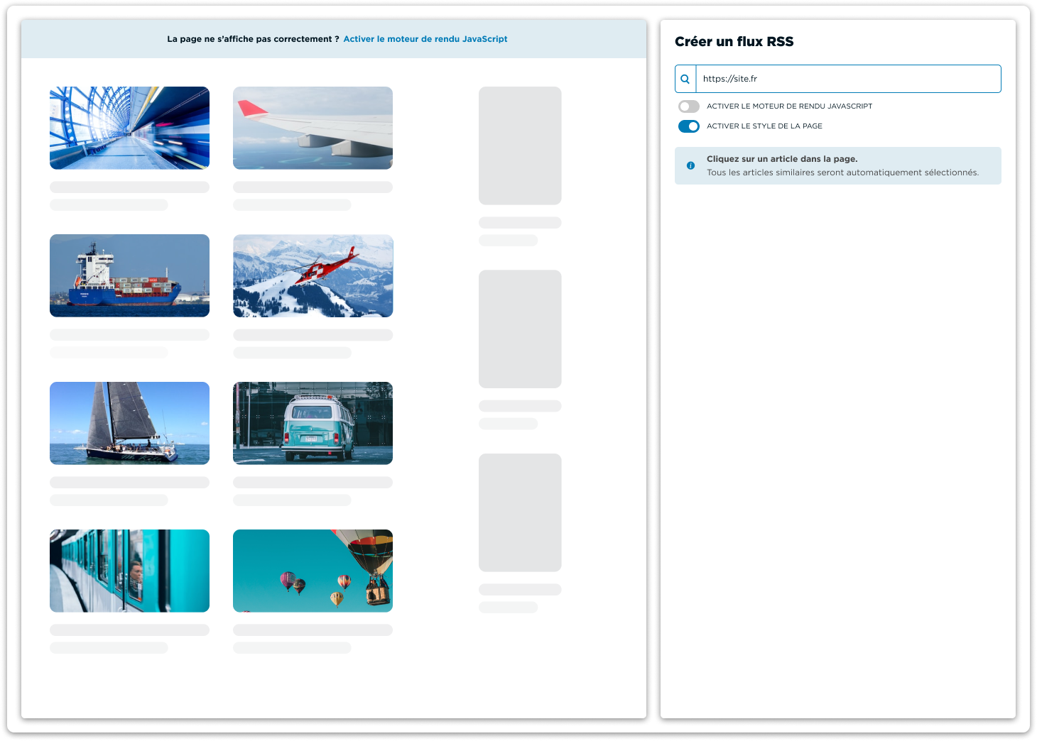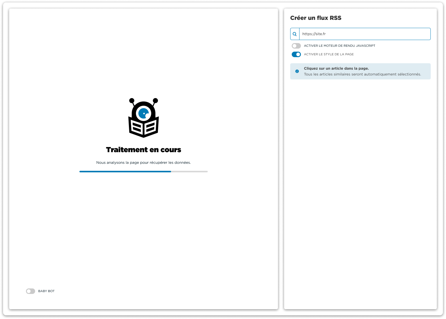 Les sources qui vous résistaient jusqu’alors seront analysées et affichées dans l’interface de création de flux RSS. Les pages web interactives ne posent plus de problème, ni pour Curebot, ni pour vous !